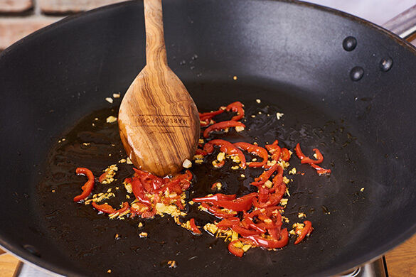 Inzwischen den Knoblauch und die Peperoni nach Geschmack in einer großen Pfanne mit 1EL Olivenöl bei mittlerer Hitze ca. 1Min. anschwitzen.