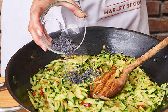 Die Zucchini mit ½TL Salz dazugeben und 5–7Min. braten. Tipp: Je nach Größe der Pfanne ggf. eine zweite Pfanne verwenden. 2TL Butter und ca. 100ml Pastawasser hinzugeben. Gut verrühren, damit die Sauce bindet. Anschließend den Mohn unterrühren.