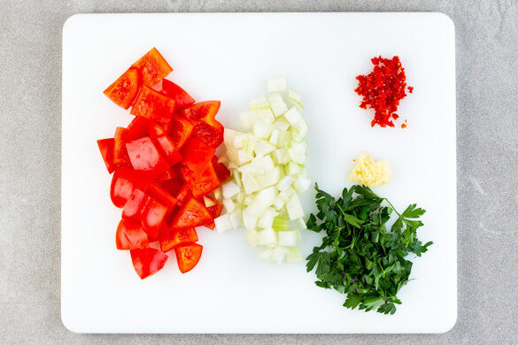 Den Backofen 200°C (180°C Umluft) vorheizen. Die Paprika vierteln, entkernen und in grobe Stücke schneiden. Die Zwiebel schälen, halbieren und grob würfeln. Den Knoblauch schälen und fein würfeln. Die Peperoni für weniger Schärfe ggf. entkernen und die ½ oder nach Geschmack mehr fein würfeln. Die Petersilienblätter abzupfen und grob hacken.