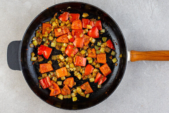 Die Paprika und die Zwiebeln in einer großen, tiefen Pfanne mit 2EL Olivenöl bei mittlerer Hitze und 2–3Min. anbraten. Den Knoblauch, die Peperoni nach Geschmack und 1TL Gewürzmischung unterrühren und ca. 30Sek. mitbraten.