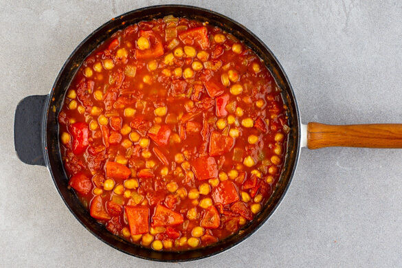 Die Kichererbsen in einem Sieb kalt abspülen, dann zum Gemüse in die Pfanne geben. Die gehackten Tomaten und 100–150ml Wasser unterrühren, mit mehr Gewürzmischung sowie Salz und Pfeffer abschmecken und die Sauce ca. 10Min. einköcheln lassen.