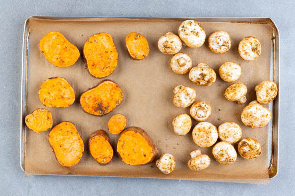 Den Backofen auf 240°C (220°C Umluft) vorheizen. Die Süßkartoffel samt Schale in ca. 1,5cm dicke Scheiben schneiden, dann mit den Pilzen auf ein mit Backpapier ausgelegtes Backblech geben und mit 2EL Olivenöl, der Gewürzmischung, 1 kräftigen Prise Salz und 1 Prise Pfeffer vermengen. Das Gemüse ca. 10Min. im Ofen backen.