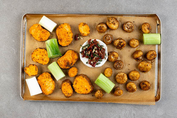 Ofengemüse allein ist schon ein kulinarisches Highlight, aber in Kombination mit gebackenem Camembert ist es ein wahr gewordener Traum. Wir rösten heute Süßkartoffel, Pilze und Lauch im Ofen schön goldbraun und stellen ihnen den zartschmelzenden Weichkäse zur Seite, den wir mit einer herzhaften Mischung aus getrockneten Tomaten und Thymian garnieren. So ist er nicht nur herrlich cremig, sondern auch wunderbar würzig …