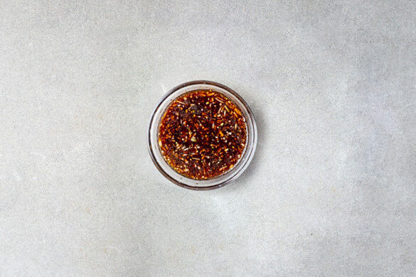 Den Mangold mit ¾ des Dressings vermengen.