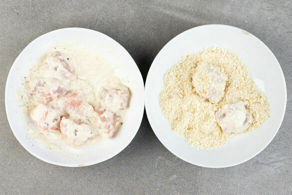¾ des Panko-Paniermehls auf einen tiefen Teller geben. Das Fleisch trocken tupfen und in ca. 3cm große Stücke schneiden. 8EL Mehl, 1TL Backpulver, je 1 kräftige Prise Salz und Pfeffer sowie 100ml Wasser mit einem Schneebesen zu einem glatten Teig verrühren. Das Fleisch mit je 1 Prise Salz und Pfeffer würzen, zuerst im Teig und anschließend im Panko-Paniermehl wenden.