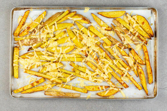 Den Backofen auf 220°C (200°C Umluft) vorheizen. Die Kartoffeln samt Schale in 0,5–1cm dicke Stifte schneiden und auf zwei mit Backpapier ausgelegten Backblechen mit insgesamt 2EL Olivenöl, ½TL Salz und 1 kräftigen Prise Pfeffer vermengen. Die Kartoffeln 20–25Min. im Ofen backen, bis sie knusprig und goldbraun sind.