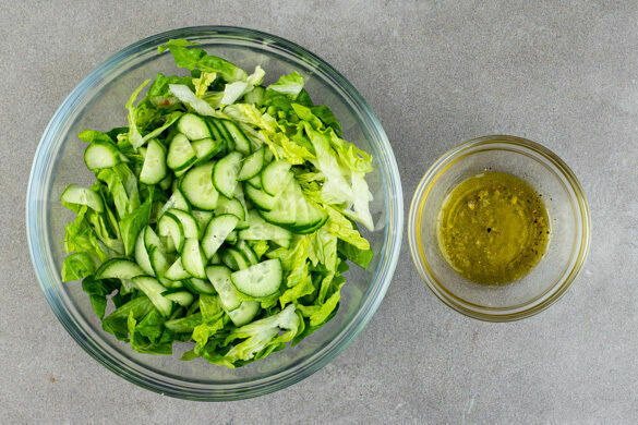 Den Salat in feine Streifen schneiden. Die Gurke längs halbieren, in dünne Scheiben schneiden und mit dem Salat vermengen. 2EL Olivenöl mit 1EL Essig sowie je 1 kräftigen Prise Salz, Pfeffer und Zucker zu einem Dressing verrühren, aber noch nicht mit dem Salat mischen.