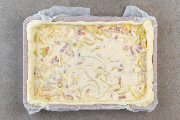 Den Teig vorsichtig ausrollen und mit den Fingern leicht auseinanderziehen oder mit einem Nudelholz etwas ausdünnen. Mit dem Backpapier nach unten in eine ca. 30x40cm große Auflaufform oder eine Tarteform legen und einen Rand formen. Der Rand der Backform sollte nicht höher als 4cm sein. Den Teigboden gleichmäßig mit einer Gabel lochen, dann die Füllung auf dem Teig verteilen.
