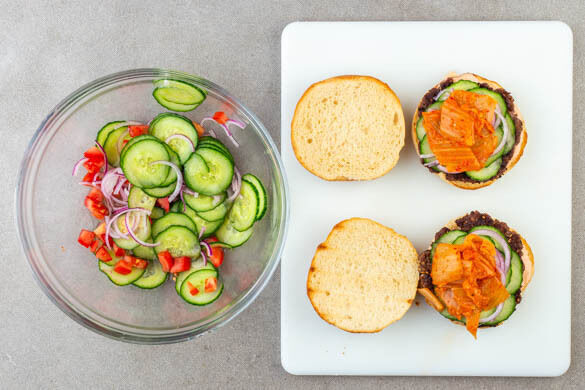 Die Gurken abgießen. Die Brötchen mit 1EL Kimchisauce bestreichen, dann mit den Pattys, den Gurken, dem Kimchi und den Zwiebeln belegen. Die restlichen Gurken und Zwiebeln mit den Tomaten und dem Sesamöl vermengen. Die Burger mit den Karottenpommes anrichten und mit dem Salat als Beilage servieren.