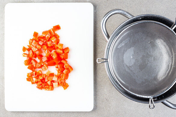 Einen großen Topf mit Wasser bis unter den Dampfkorb füllen und das Wasser zum Kochen bringen. Tipp: Statt dem Dampfkorb kann auch ein passendes Sieb verwendet werden. Die Tomate in ca. 1cm große Würfel schneiden.