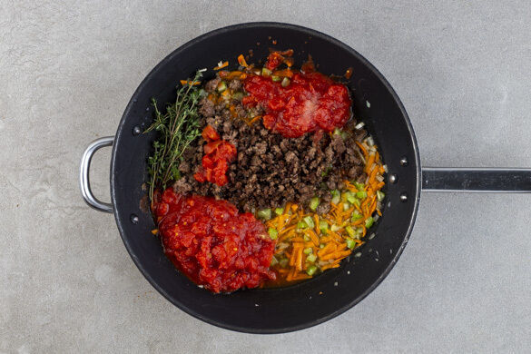 Das Hackfleisch mit den gehackten Tomaten, dem Thymian, dem Brühgewürz, 100ml Wasser und 1 kräftigen Prise Zucker zu dem Gemüse hinzufügen und die Sauce unter Rühren zum Kochen bringen. Bei mittlerer Hitze 8–10Min. kochen lassen, bis die Sauce die gewünschte Konsistenz erreicht hat. Nach Geschmack mit Salz und Pfeffer würzen und die Thymianzweige entfernen.