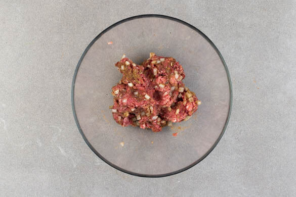 Den Knoblauch schälen und sehr fein würfeln oder durch eine Knoblauchpresse drücken. Die Zwiebel schälen, halbieren und fein würfeln. Das Hackfleisch mit dem Knoblauch, der ½ der Zwiebeln, der Gewürzmischung und je 1 kräftigen Prise Salz und Pfeffer verkneten.