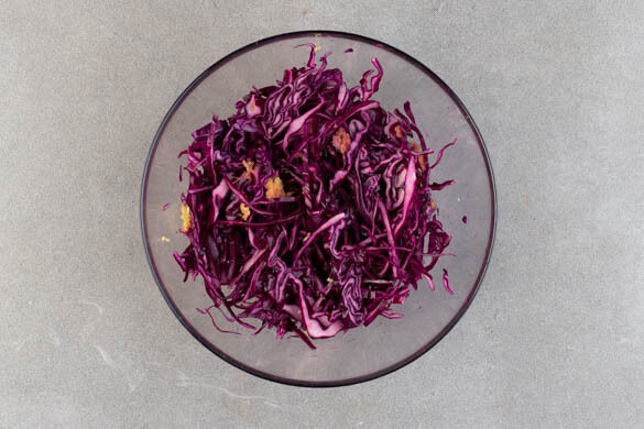 Den Backofen auf 200°C (180°C Umluft) vorheizen. 50ml Essig und 50ml Wasser mit 1EL Zucker und 2TL Salz in einem kleinen Topf zum Kochen bringen, dabei gelegentlich umrühren. Den Topf vom Herd nehmen. Den Ingwer schälen und fein reiben. Den Rotkohl in feine Streifen schneiden. Den Ingwer und den Rotkohl mit dem Einlegesud vermengen.