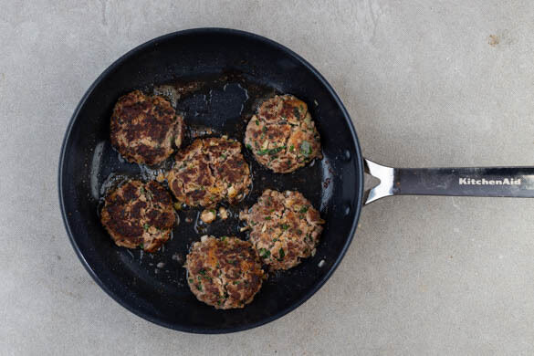 Die Bouletten in einer großen Pfanne mit 1EL Pflanzenöl bei mittlerer Hitze auf jeder Seite ca. 4Min. braten, bis die Bouletten durch sind. Aus der Pfanne nehmen und warm halten. Die Pfanne mit etwas Küchenkrepp auswischen.