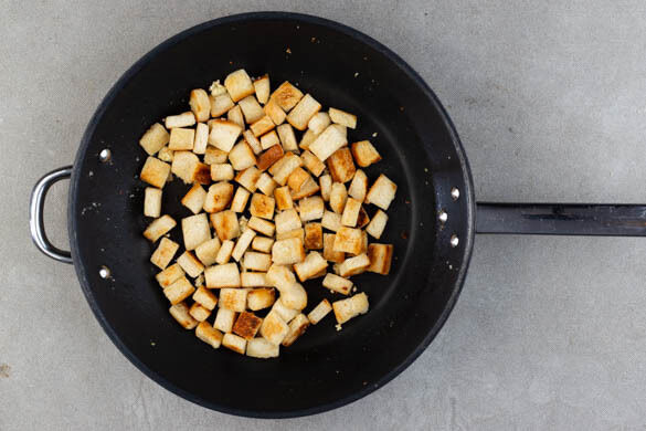 Eine große Pfanne mittelhoch bis stark erhitzen. Die Brotwürfel zugeben, mit 4EL Olivenöl beträufeln und mit 1 kräftigen Prise Salz bestreuen, dann unter gelegentlichem Rühren in 6–8Min. goldbraun und knusprig rösten. Den Knoblauch schälen und fein würfeln, zum Brot in die Pfanne geben und ca. 2Min. mitbraten. Die Brotwürfel aus der Pfanne nehmen, die Pfanne aufbewahren.