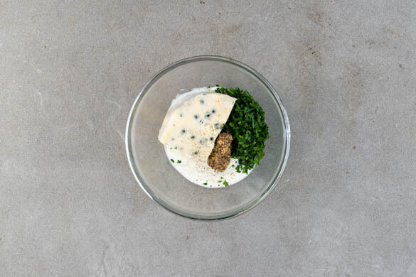 Die Petersilienblätter von den Stängeln zupfen und fein schneiden. Den Schnittlauch ebenfalls fein schneiden. Tipp: Wer möchte, kann auch die Petersilienstängel klein schneiden und verwenden. Den Käse mit dem Joghurt, den Kräutern, 1TL körnigem Senf und 1 kräftigen Prise Pfeffer in eine Schüssel geben.