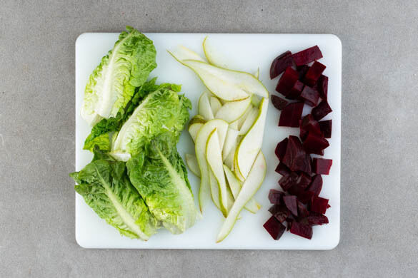 Die ½ der Roten Bete abtropfen lassen und in mundgerechte Stücke schneiden. Tipp: Da Rote Bete stark färbt, beim Verarbeiten am besten Küchenhandschuhe und Schürze tragen. Die Birne vierteln, entkernen und in dünne Scheiben schneiden. Den Salat jeweils vom Strunk befreien und längs halbieren.