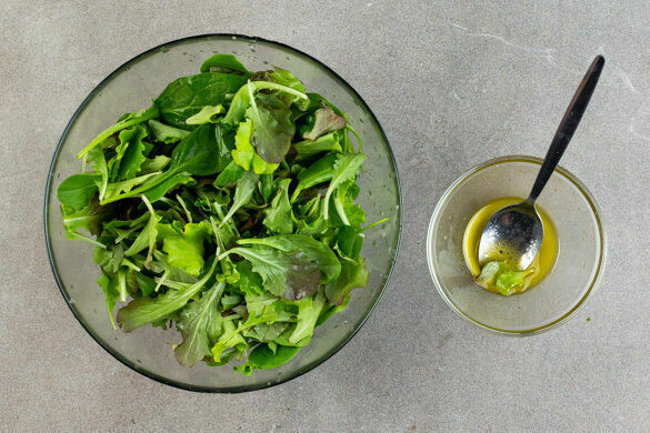 1EL Olivenöl und 1TL Essig mit je 1 kräftigen Prise Salz und Pfeffer verrühren. Den Salat kurz vor dem Servieren mit dem Dressing vermengen und auf Teller verteilen.