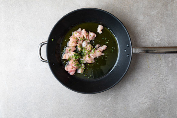 Die Estragonblätter abzupfen und fein schneiden. Das Fleisch trocken tupfen und mit ⅓ des Estragons, je 1 Prise Salz und Pfeffer sowie 2EL Olivenöl vermengen. In einer großen Pfanne bei mittlerer Hitze 3–4Min. von allen Seiten anbraten. Aus der Pfanne nehmen und beiseitestellen, die Pfanne aufbewahren.