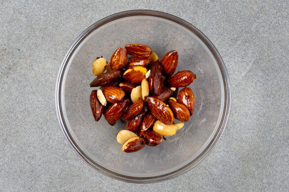 Die Rauchmandeln in einer kleinen Pfanne ohne Zugabe von Fett bei mittlerer Hitze 1–2Min. goldbraun anrösten. Dann 1EL Butter hinzufügen und leicht bräunen lassen. Die Rauchmandeln samt Butter in einem Schälchen beiseitestellen.