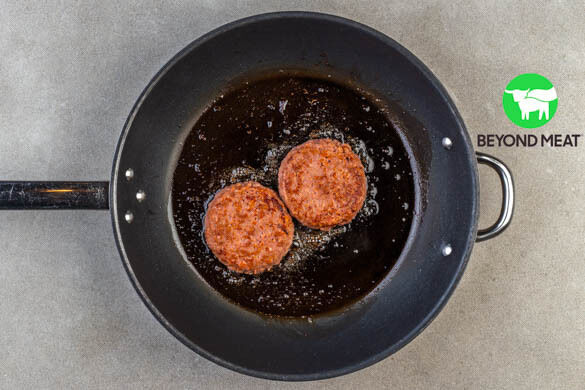 Die Burgerpattys in einer großen Pfanne mit 2EL Olivenöl bei mittlerer bis starker Hitze auf jeder Seite 2–3Min. goldbraun braten. Die Pattys aus der Pfanne nehmen und in ca. 1cm breite Streifen schneiden.
