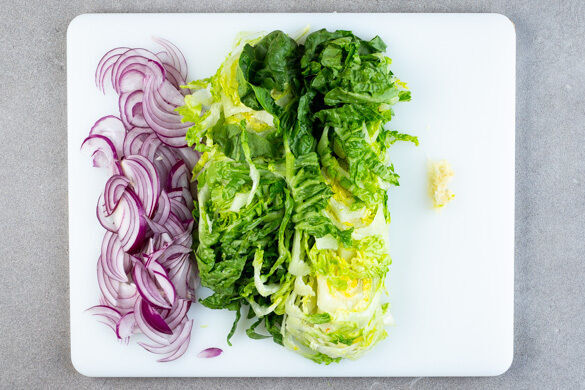 Den Backofen auf 240°C (220°C Umluft) vorheizen. Den Romanasalat in feine Streifen schneiden, den Strunk entfernen. Die Zwiebeln schälen, halbieren und ebenfalls in feine Streifen schneiden. Den Knoblauch schälen und sehr fein würfeln oder durch eine Knoblauchpresse drücken.