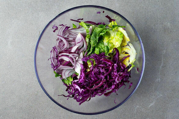 Den Rotkohl in feine Streifen schneiden, mit ½TL Salz vermengen und mit den Händen 2–3Min. gut durchkneten, bis der Kohl weich wird. Dabei am besten Küchenhandschuhe tragen. Dann den Romanasalat und die Zwiebeln dazugeben.