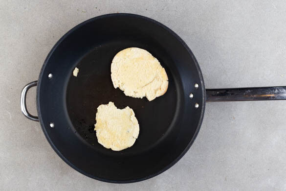 Eine große Pfanne ohne Öl stark erhitzen. Die Pitabrote halbieren und die Schnittflächen mit je ½TL Olivenöl beträufeln, dann in der rauchend heißen Pfanne mit den Schnittflächen nach unten ca. 1Min. anrösten, bis sie knusprig sind und dunkle Stellen haben.