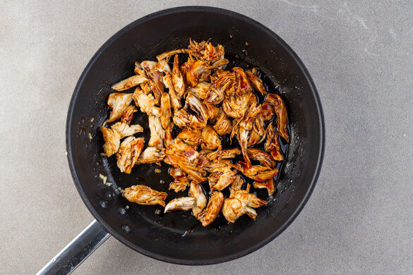 Das Fleisch mit 2 Gabeln zerzupfen. Den Knoblauch in einer großen Pfanne mit 1EL Olivenöl bei mittlerer Hitze ca. 30Sek. anbraten, dann das Fleisch, die restliche Sriracha-Sauce und die Teriyakisauce dazugeben und 2–3Min. mitbraten. Das Fleisch soll gut mit der Sauce bedeckt sein. Mit Salz und Pfeffer würzen.