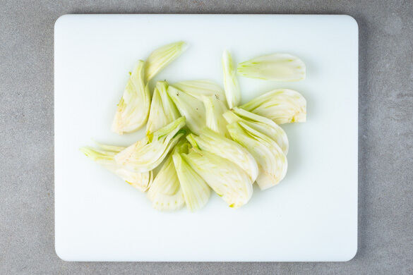 Die Grillpfanne vorheizen. Den Fenchel längs halbieren und in dünne Streifen schneiden, dabei den Strunk entfernen.