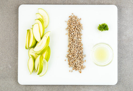 Die Äpfel vierteln, entkernen und in dünne Scheiben schneiden. Die Limettenschale abreiben, dann die Limetten halbieren und auspressen. Die Sonnenblumenkerne in einer Grillpfanne ohne Zugabe von Fett bei mittlerer Hitze 1–2Min. goldbraun anrösten, dann herausnehmen.