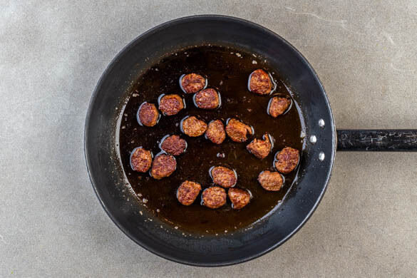Die Wurst von der Wursthülle befreien, in mundgerechte Stücke schneiden und in einer mittelgroßen Pfanne mit 1EL Olivenöl bei mittlerer bis starker Hitze in 7–10Min. goldbraun und knusprig braten, dabei gelegentlich umrühren.