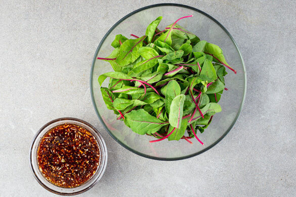 Den Mangold mit ¾ des Dressings vermengen.