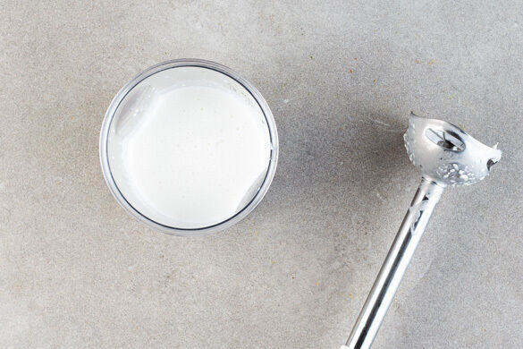Die Limettenschale abreiben, die Limette halbieren und auspressen. Die Knoblauch-Ingwer-Paste mit dem Limettensaft, der ½ der Kokosmilch und 1 kräftigen Prise Salz in einem hohen Gefäß mit einem Stabmixer fein pürieren. Tipp: Mit der übrigen Kokosmilch den nächsten Smoothie verfeinern.
