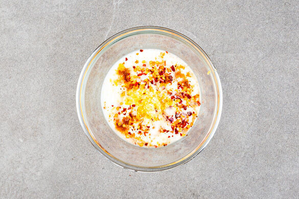 Den Joghurt mit der Zitronenschale verrühren und nach Geschmack mit dem übrigen Zitronensaft, der restlichen Gewürzmischung und 2 Prisen Salz verfeinern.