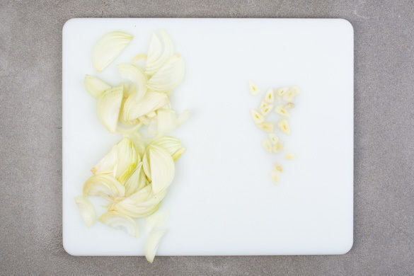 Die Zwiebel schälen, halbieren und in feine Streifen schneiden. Den Knoblauch schälen und in feine Scheibchen schneiden.
