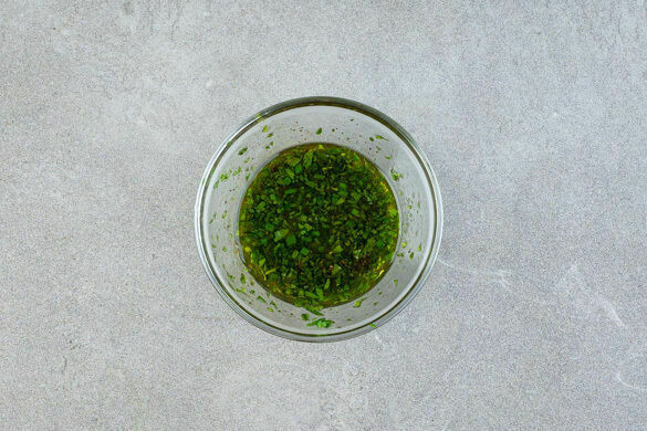 Die Petersilienblätter von den Stängeln streifen und fein schneiden. Den Schnittlauch in kleine Röllchen schneiden. Das Chutney mit den Kräutern__, 2EL hellem Essig und 1TL Salz verrühren, bis sich das Salz aufgelöst hat. Anschließend 4EL Olivenöl, 2EL Wasser und 1 kräftige Prise Pfeffer unterrühren.