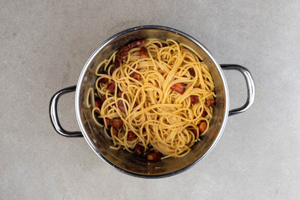 Wenn die Pasta ca. 4Min. gekocht hat, die Saucenschüssel auf dem Pastatopf platzieren. Sofort und stetig mit einem Schneebesen rühren und die Schüssel zwischendurch immer wieder vom Topf nehmen und wieder aufsetzen, damit das Ei nicht zu heiß wird und gerinnt. Nach 1–2Min. 2–3EL Pastawasser unterrühren und noch weitere 2–3Min. rühren, bis die Sauce schaumig und heiß ist.