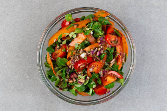 Ein leichter, aber sättigender Salat für einen perfekten Abend: Mit saftigen Hähnchenstreifen, nussigem Feldsalat, fruchtigen Tomaten, knackigen Karotten und frischer Petersilie in einer Vinaigrette mit köstlich-süßer Balsamicocreme kann nichts schiefgehen. Angeröstete Kürbiskerne als leckeres Knuspertopping erhöhen den Genussfaktor. Lass es dir schmecken!