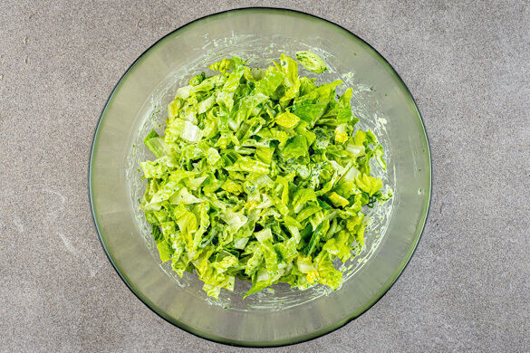 Den Romanasalat in dünne Streifen schneiden, dabei den harten Strunk entfernen. Die Lauchzwiebeln in feine Ringe schneiden und mit dem Romanasalat und der ½ des Dressings vermengen. Die Kichererbsen-Flammkuchen in Stücke schneiden und den Salat darauf anrichten. Mit dem restlichen Ranch-Dressing beträufeln und mit den Zitronenspalten servieren.