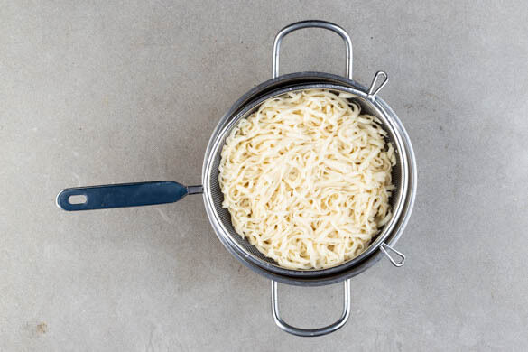 Die Nudeln in das kochende Wasser geben und in 3–5Min. bissfest kochen. In ein Sieb abgießen und kalt abschrecken. Inzwischen die Cashews grob hacken.