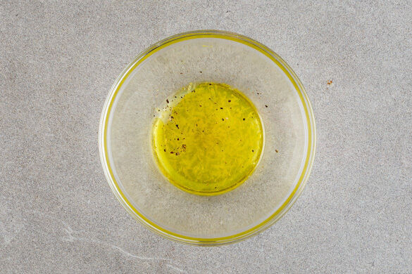 Die Schale von 1 Zitrone abreiben, dann die Zitrone halbieren und auspressen. Die übrige Zitrone in Spalten schneiden. 2EL Olivenöl, den Zitronensaft, 1–2 Prisen Zitronenschale oder mehr nach Geschmack sowie je 2 kräftige Prisen Salz, Pfeffer und Zucker zu einem Dressing verrühren.