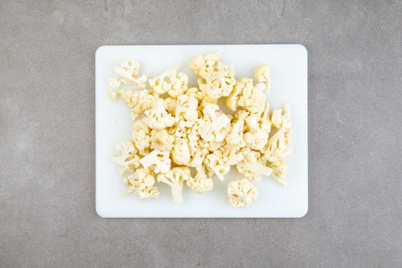Den Backofen auf 240°C (220°C Umluft) vorheizen. Den Blumenkohl in 2–3cm große Röschen schneiden.