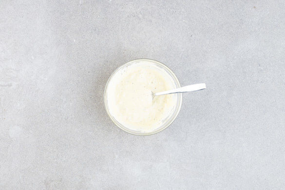 Die ½ des Käses mit 1TL Zitronenschale, 1–2TL Zitronensaft, 2EL Mayonnaise, 2EL Senf und 1EL Olivenöl verrühren. Mit Salz, Pfeffer und 1 Prise Zucker abschmecken und den restlichen Knoblauch untermischen.