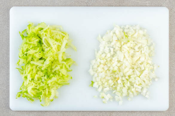 Die Zwiebel schälen und fein würfeln. Den Apfel vierteln, entkernen und fein reiben.