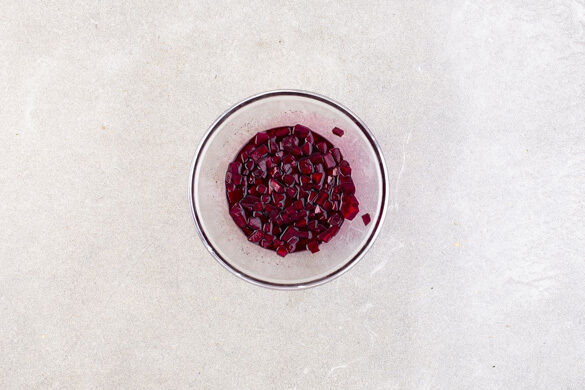 2EL hellen Essig mit ½TL Zucker und 1 Prise Salz verrühren. Die Rote Bete schälen, in kleine Würfel schneiden und mit dem Essig vermengen. Bis zum Servieren beiseitestellen. Tipp: Da Rote Bete stark färbt, beim Verarbeiten am besten Küchenhandschuhe und Schürze tragen.