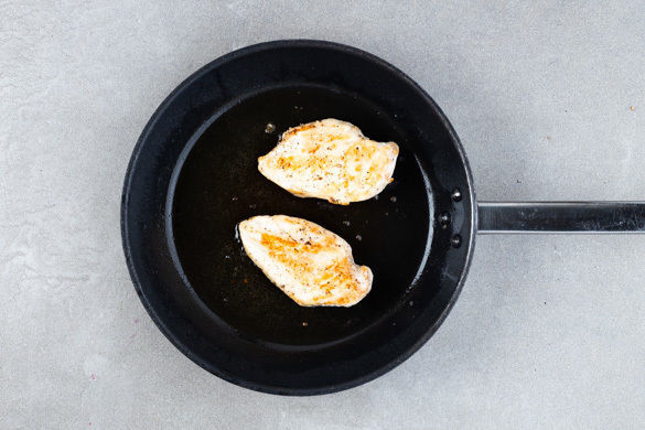 Das Fleisch trocken tupfen und in einer zweiten großen Pfanne mit 1–2EL Olivenöl bei starker Hitze auf beiden Seiten 1–2Min. scharf anbraten. Aus der Pfanne nehmen und mit Salz und Pfeffer würzen.