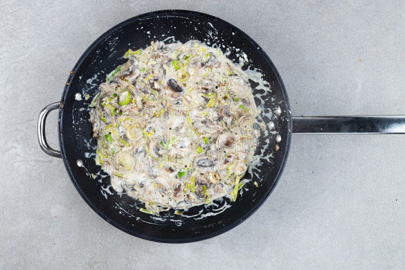 Die Zwiebel schälen, halbieren und in möglichst feine Würfel schneiden. Mit dem Thymian in einer großen Pfanne mit 1EL Olivenöl bei mittlerer Hitze 1–2Min. glasig andünsten. Die Pilze hinzugeben und 2–3Min. bei starker Hitze scharf anbraten. Die 1/2 der Crème fraîche unterrühren und 1–2Min. einköcheln lassen.