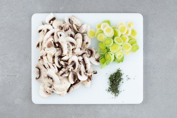 Den Backofen auf 200°C Umluft (220°C Ober-/Unterhitze) vorheizen. Die Pilze ggf. mit etwas Küchenkrepp oder einer Bürste säubern und in dünne Scheiben schneiden. Die Thymianblätter von den Stängeln streifen und fein schneiden.