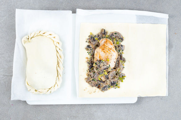 Den Teig halbieren. Auf jedem Teigstück etwas Füllung in Größe der Fleischstücke verteilen, ein Fleischstück darauflegen und mit der restlichen Füllung bestreichen. Den Teig einschlagen und an den Seiten verschließen. Die Teigpakete mit dem Backpapier auf ein Backblech legen und auf der mittleren Schiene im Ofen 15–20Min. goldbraun backen.